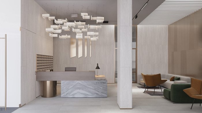 В ЖК «Гранях» уютное пространство начинается не с порога квартиры, а сразу же при входе в холл жилого комплекса.
