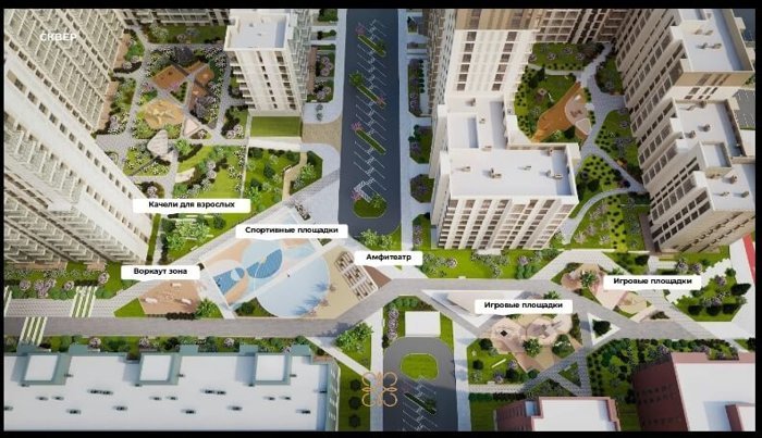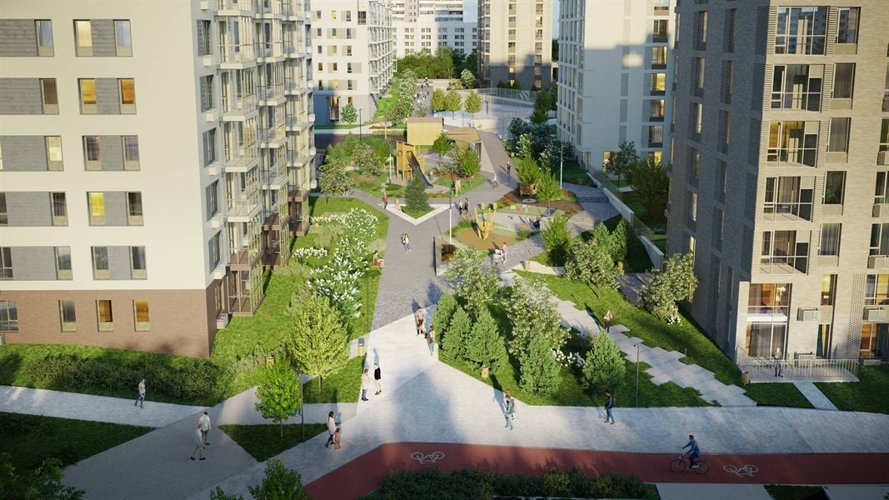 Внутри квартала появится прогулочный сквер с амфитеатром и зонами для активного отдыха: велодорожки, площадки для паркура и воркаута.