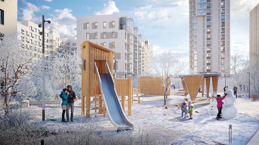 Круглогодичные дворы-скверы: летом — игровые зоны с безопасными аттракционами, зимой — веселая снежная горка.